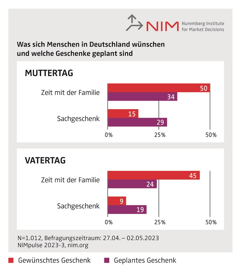 Banner und Plakate in den Schaufenstern der Einkaufspassagen, Pop-up Fenster im Web, glücklich beschenkte Eltern in Radio und TV – es ist nicht zu übersehen: Muttertag und Vatertag stehen vor der Tür und der Einzelhandel rührt die Werbetrommel. Damit stellt sich für viele Kinder die alljährliche Frage: Was wünschen sich Mama und Papa eigentlich zu ihrem Ehrentag? Viele werden den Weg in die Blumenläden oder zu den Pralinenregalen gehen – doch macht man den Eltern damit wirklich eine Freude? Eine aktuelle repräsentative Befragung des Nürnberg Institut für Marktentscheidungen (NIM) zeigt: Während Eltern sich Zeit mit der Familie wünschen, planen viele Kinder Sachgeschenke – und geben dafür ganz schön viel Geld aus.
