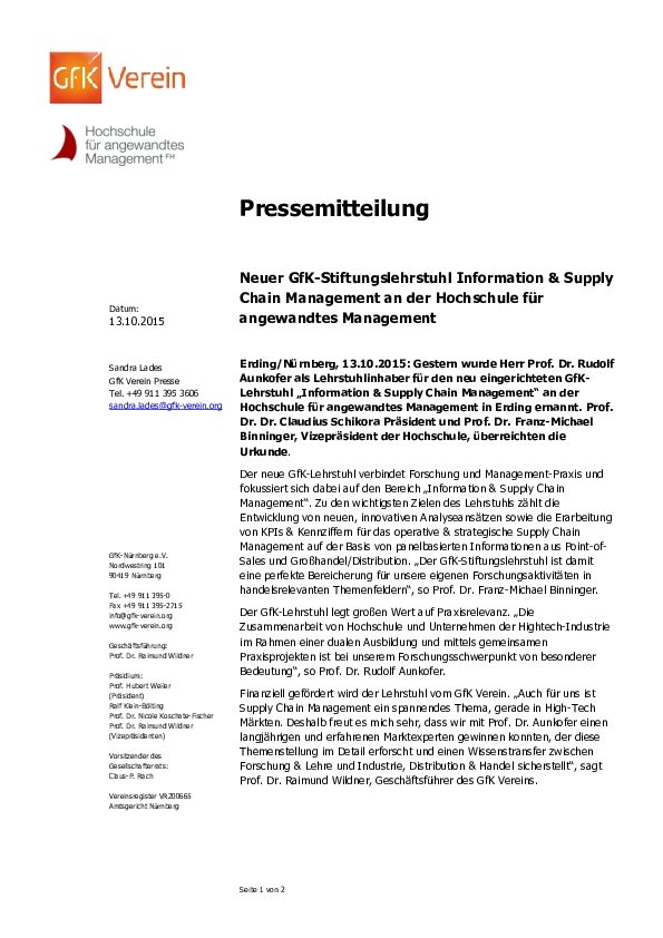 • Neuer GfK-Stiftungslehrstuhl Information & Supply Chain Management an der Hochschule für angewandtes Management