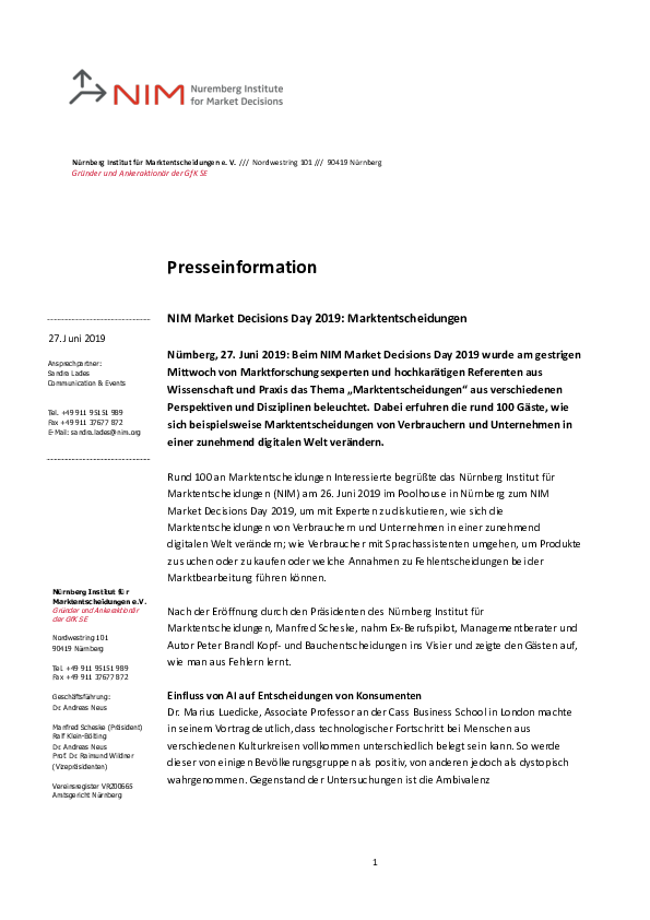 Rund 100 an Marktentscheidungen Interessierte begrüßte das Nürnberg Institut für Marktentscheidungen (NIM) am 26. Juni 2019 im Poolhouse in Nürnberg zum NIM Market Decisions Day 2019, um mit Experten zu diskutieren, wie sich die Marktentscheidungen von Verbrauchern und Unternehmen in einer zunehmend digitalen Welt verändern; wie Verbraucher mit Sprachassistenten umgehen, um Produkte zu suchen oder zu kaufen oder welche Annahmen zu Fehlentscheidungen bei der Marktbearbeitung führen können.