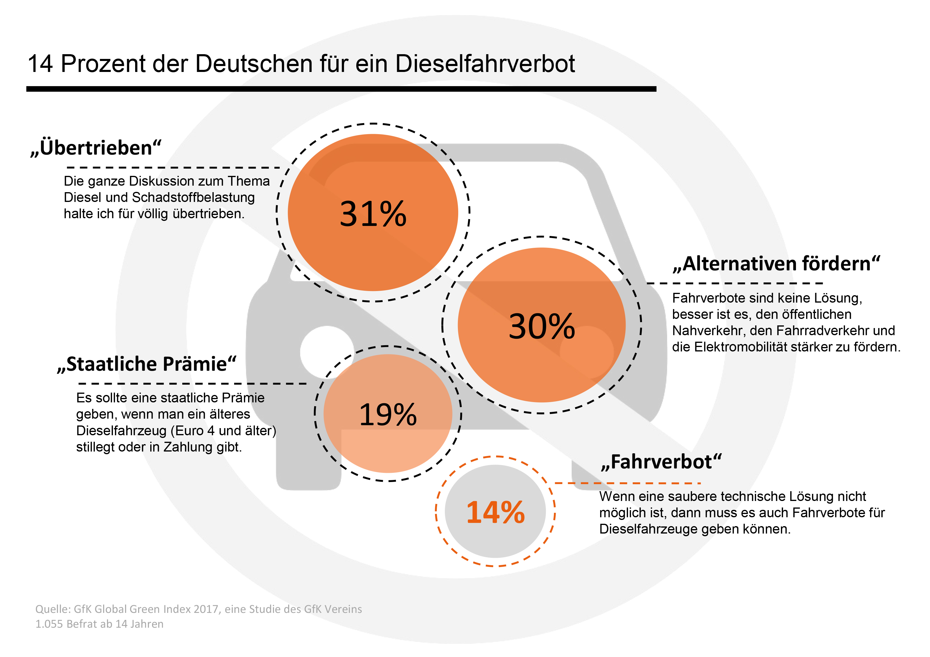 Vor dem Hintergrund der anhaltenden Diskussion um die Schadstoffbelastung in Städten und mögliche Fahrverbote für Dieselfahrzeuge hat der GfK Verein die Einstellung der Deutschen zu diesem Thema untersucht. Die Ergebnisse zeichnen ein heterogenes Bild: So befürwortet im Herbst 2017 insgesamt nur eine Minderheit von 14 Prozent ein Fahrverbot für Dieselfahrzeuge in Städten, wenn eine saubere technische Lösung nicht möglich ist. Für eine stärkere Förderung des öffentlichen Nahverkehrs, des Fahrradverkehrs und der Elektromobilität sprechen sich 30 Prozent der Befragten aus. Und knapp jeder Dritte in Deutschland hält die Diskussion zum Thema Diesel und Schadstoffbelastung für übertrieben.