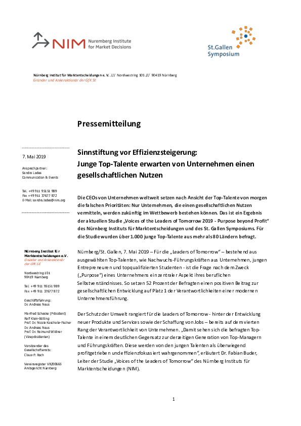 Die CEOs von Unternehmen weltweit setzen nach Ansicht der Toptalente von morgen die falschen Prioritäten: Nur Unternehmen, die einen gesellschaftlichen Nutzen vermitteln, werden zukünftig im Wettbewerb bestehen können. Das ist ein Ergebnis der aktuellen Studie „Voices of the Leaders of Tomorrow 2019 - Purpose beyond Profit“ des Nürnberg Institut für Marktentscheidungen und des St. Gallen Symposiums. Für die Studie wurden über 1.000 junge Toptalente aus mehr als 80 Ländern befragt.