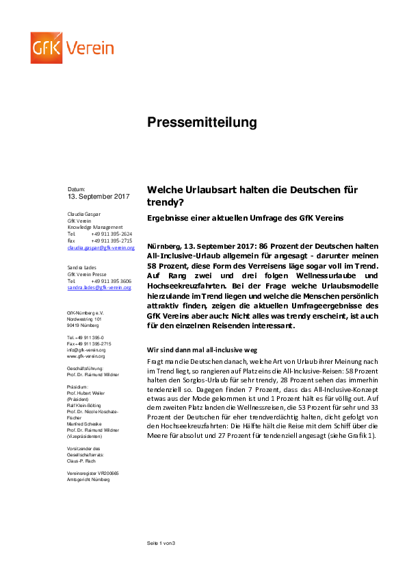 Nürnberg, 13. September 2017: 86 Prozent der Deutschen halten All-Inclusive-Urlaub allgemein für angesagt - darunter meinen 58 Prozent, diese Form des Verreisens läge sogar voll im Trend. Auf Rang zwei und drei folgen Wellnessurlaube und Hochseekreuzfahrten. Bei der Frage welche Urlaubsmodelle hierzulande im Trend liegen und welche die Menschen persönlich attraktiv finden, zeigen die aktuellen Umfrageergebnisse des GfK Vereins aber auch: Nicht alles was trendy erscheint, ist auch für den einzelnen Reisenden interessant.