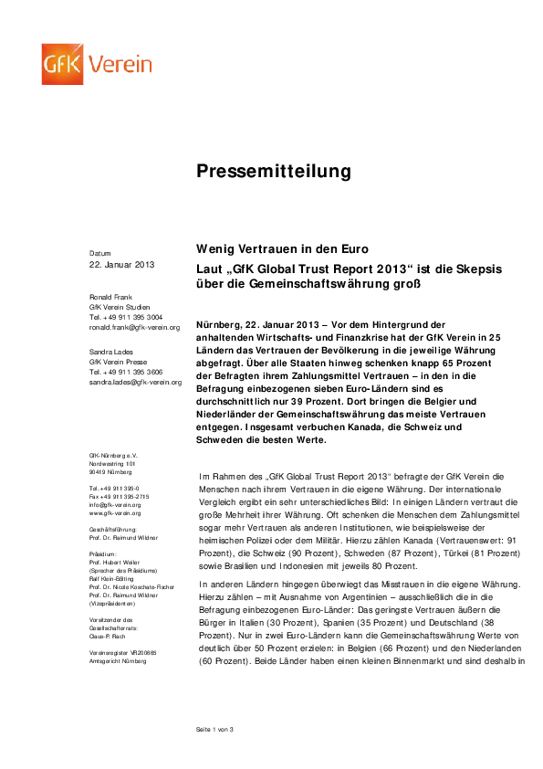 Diese Ergebnisse sind ein Auszug aus dem „GfK Global Trust Report“ 2013 und basieren auf rund 28.000 Verbraucherinterviews, die im Auftrag des GfK Vereins im Zeitraum September bis November 2012 in insgesamt 25 Ländern durchgeführt wurden.