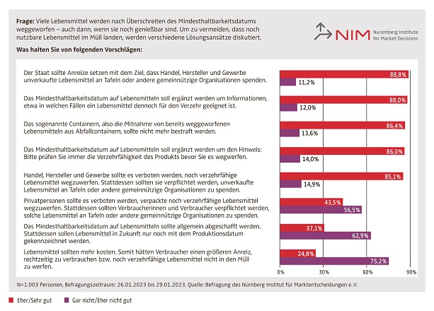 Auch auf politischer Ebene werden derzeit wieder Vorschläge diskutiert, mit denen das Müllaufkommen verringert werden soll. Wie die Menschen in Deutschland dazu stehen, dazu decken die NIM-Daten klare Tendenzen auf. So halten das Mindesthaltbarkeitsdatum 63 Prozent nach wie vor für wichtig. Sehr kritisch sehen Verbraucherinnen und Verbraucher Maßnahmen, die sich direkt auf diese auswirken würden. Höhere Preise, die einen Anreiz bieten würden, Lebensmittelabfälle zu vermeiden, werden ebenso abgelehnt wie Verbote für Privatpersonen, verpackte noch verzehrfähige Lebensmittel wegzuwerfen. Vielmehr sehen die Menschen in Deutschland Hersteller, Handel und Gewerbe in der Pflicht. Eine große Mehrheit wünscht sich eine Auflage für diese, unverkaufte Lebensmittel an Tafeln oder andere gemeinnützige Organisationen zu spenden. Auch die geplante Legalisierung des Containerns wird begrüßt. Ergänzungen zum Mindesthaltbarkeitsdatum stehen bei einer Mehrheit ebenfalls hoch im Kurs. Etwa in Form von Informationen, in welchen Fällen ein Lebensmittel nach Ablauf noch gegessen werden kann oder in Form eines Hinweises, das Produkt vor dem Wegwerfen zu überprüfen.