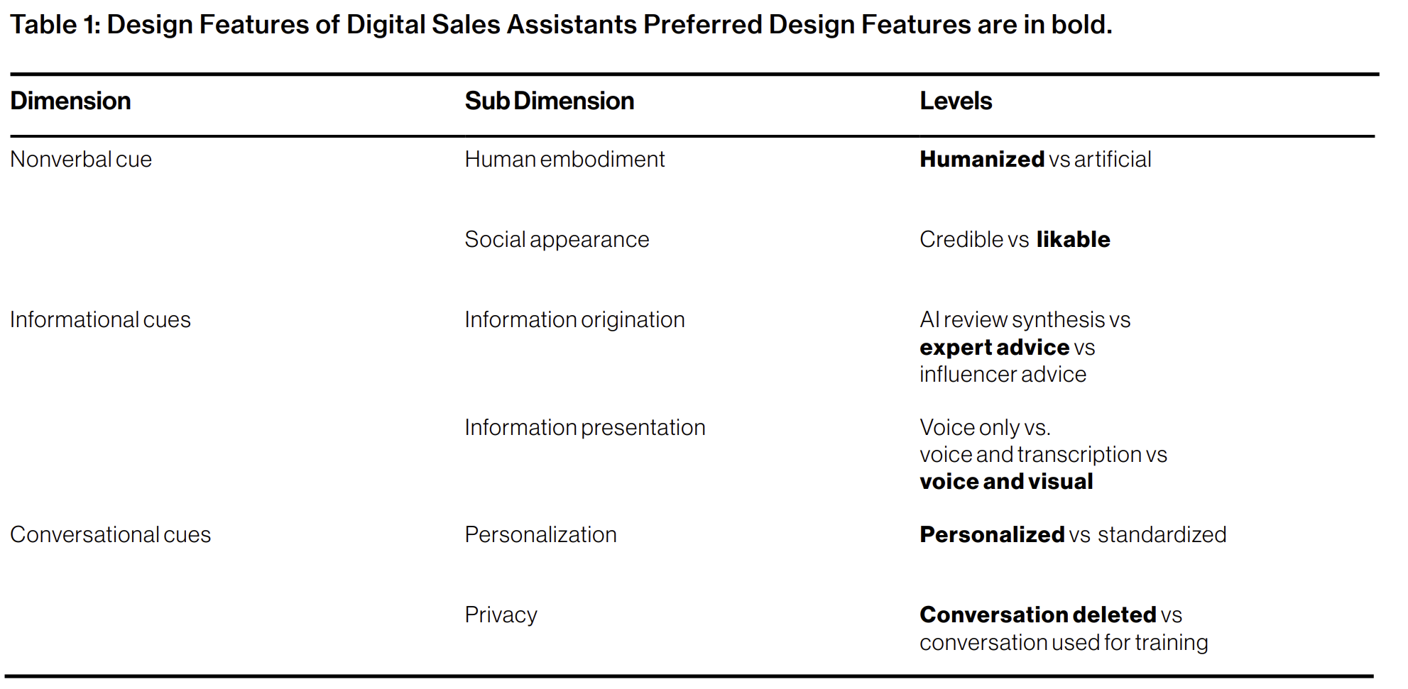 Drawing from an in-depth review of current research, we’ve identified three key feature dimensions that shape the effectiveness of digital sales assistants: nonverbal cues, informational cues, and conversational cues.
