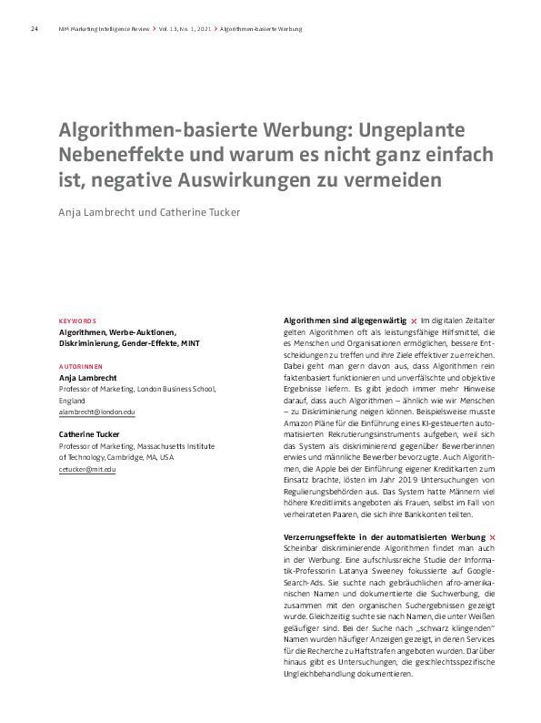 Es gibt immer mehr Hinweise, dass nicht nur Menschen, sondern auch Algorithmen zu Diskriminierung neigen können. Die vorgestellte Studie untersucht geschlechtsspezifische Diskriminierung in der Social-Media-Werbung. Die Ergebnisse deuten darauf hin, dass die Algorithmen für die automatisierte Anzeigenschaltung als solche nicht geschlechtsspezifisch agieren, aber ökonomische Kräfte zu unbeabsichtigten Verzerrungen führen könnten. Spillover-Effekte aus anderen Branchen bewirken, dass Werbetreibende einzelne Konsumentensegmente leichter erreichen können als andere. Bei einer geschlechtsneutralen Strategie ist es weniger wahrscheinlich, Frauen zu erreichen, da Frauen öfter auf Werbung reagieren als Männer. Bei gleichem Mitteleinsatz werden ungeplant mehr Männer erreicht. Lösbar wäre das Problem mit getrennten Kampagnen für Männer und Frauen. Die Antidiskriminierungsgesetzgebung in vielen Ländern schreibt Unternehmen jedoch vor, Stellenanzeigen geschlechtsneutral zu formulieren. Ironischerweise verhindern damit Gesetze, die das Ziel haben, Diskriminierung zu vermeiden, eine vergleichsweise einfache Möglichkeit, ungewünschte Ungleichbehandlung in der Online-Zielgruppenansprache auf Facebook und anderen Plattformen zu korrigieren. Die Erkenntnisse zeigen, dass es weiteren Regulierungsbedarf gibt.