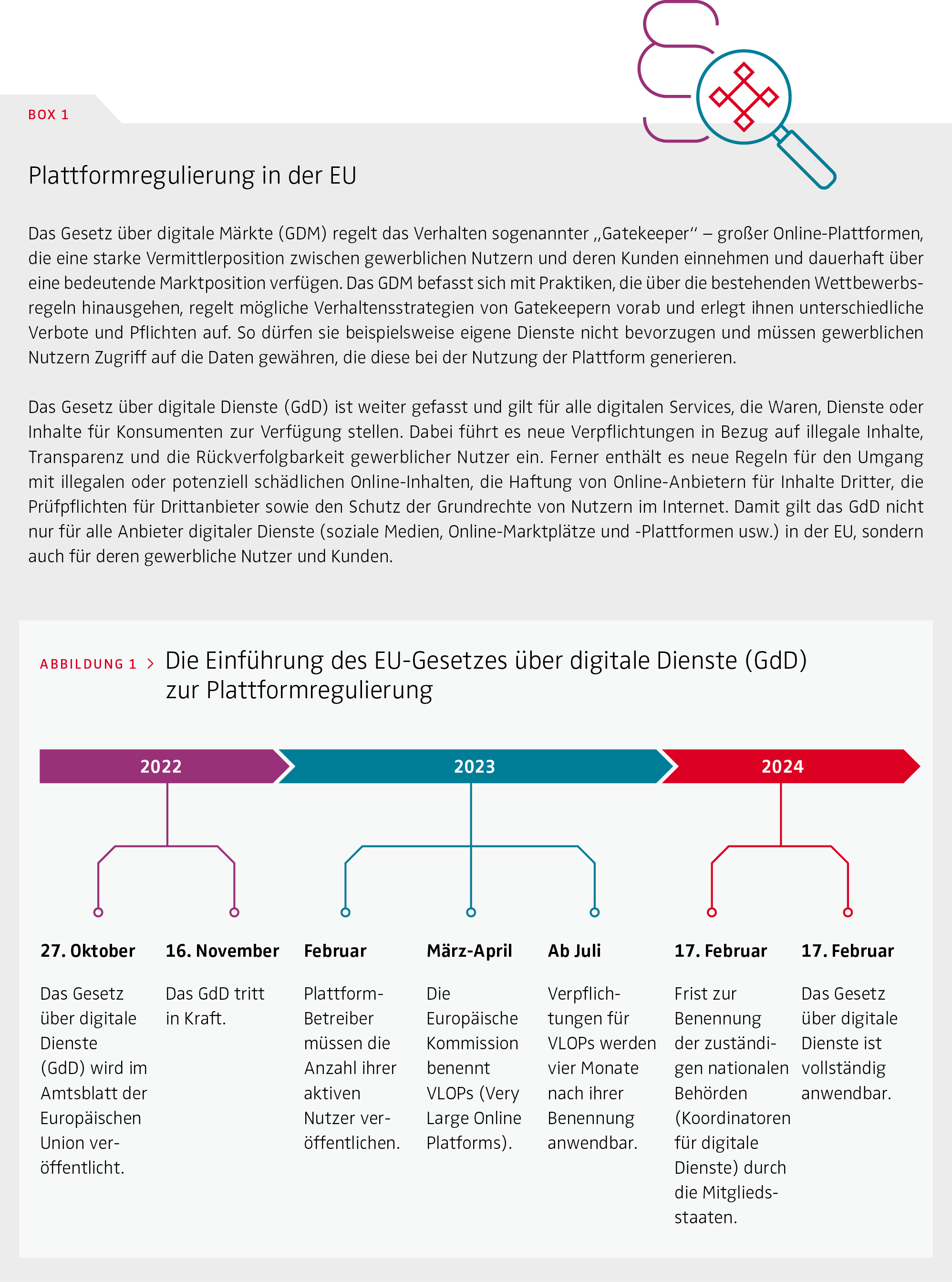 In Europa, Australien und den USA haben mehrere einflussreiche Berichte über die genannten Probleme und Methoden des Machtmissbrauchs das Interesse der Regulierungsbehörden geweckt und das regulatorische Umfeld wurde verändert. Bereits vorliegende Gesetzesvorschläge sollen beispielsweise verhindern, dass plattformspezifische Benutzeroberflächen und Dienste die Nutzer durch massive Vorselektion von Inhalten manipulieren, in die Irre führen oder suchtähnliches Verhalten auslösen. Die meisten geltenden Richtlinien und Verordnungen wurden nicht speziell für Online-Plattformen konzipiert. Die EU hat jedoch eine Plattform-to-Business-Verordnung (P2B-VO) eingeführt, um ein besseres Geschäftsumfeld für gewerbliche Nutzer von Online-Vermittlungsdiensten zu schaffen und Fairness und Transparenz in Geschäftsbeziehungen dieser Art zu fördern. Das Gesetz über digitale Märkte (GDM) und das Gesetz über digitale Dienste (GdD) sind in der gesamten EU bereits vollständig anwendbar. Box 1 gibt einen kurzen Überblick über diese zentralen Elemente der Plattformregulierung. Abbildung 1 veranschaulicht die Einführung des GdD