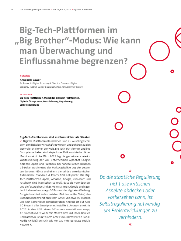 Digitale Plattformunternehmen sind zu Aushängeschildern der digitalen Wirtschaft geworden und gehören zu den wertvollsten Firmen der Welt. Big-Tech-Plattformen und ihre Ökosysteme haben ein beispielloses Maß an wirtschaftlicher Macht erreicht. Im März 2024 lag die gemeinsame Marktkapitalisierung der vier Unternehmen Alphabet-Google, Amazon, Apple und Facebook bei nahezu sieben Billionen US-Dollar, was in etwa der Marktkapitalisierung der gesamten Euronext-Börse und einem Viertel des amerikanischen Aktienindex Standard & Poor‘s 100 entspricht. Die BigTech-Plattformen Apple, Amazon, Google, Microsoft und Facebook sind inzwischen so groß, dass sie vermögender und einflussreicher sind als viele Nationen. Google und Facebook beherrschen knapp 60 Prozent der digitalen Werbung. Google dominiert in den meisten Märkten (außer China) den Suchmaschinenmarkt mit einem Anteil von etwa 90 Prozent, und sein kostenloses Betriebssystem Android ist auf rund 70 Prozent aller Smartphones installiert. Amazon erreichte 2022 in den USA einen E-Commerce-Anteil von knapp 40 Prozent und ist weiterhin Marktführer im E-Book-Bereich. Und Facebook ist mit einem Anteil von 60 Prozent an SocialMedia-Aktivitäten nach wie vor das meistgenutzte soziale Netzwerk.