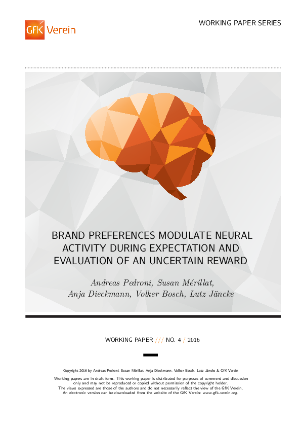 Pedroni, A., Mérillat, S., Dieckmann, A., Bosch, V., & Jäncke, L. (2016). Brand preferences modulate neural activity during expectation and evaluation of an uncertain reward. GfK Verein Working Paper Series, 2016(4).