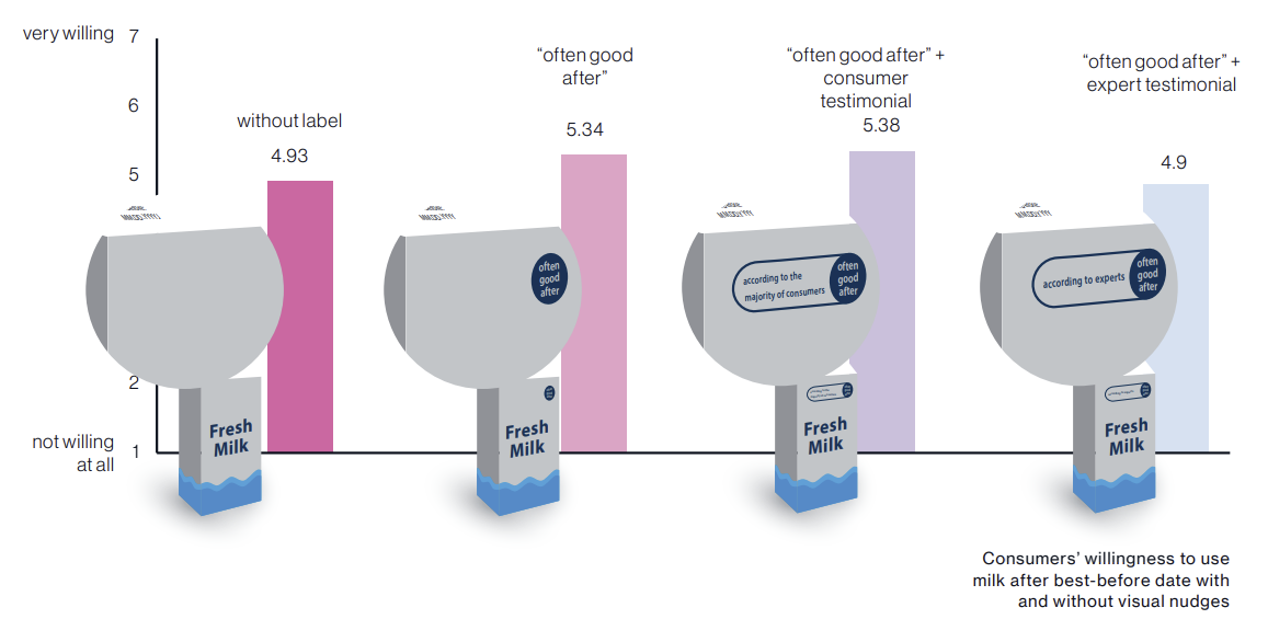 This simple nudge also proved effective in an experimental study by NIM using milk as an example. In our experiment, participants were significantly more willing to use the milk after the best-before date, provided the label “often good after” was on the package. A simple nudge is often so effective that even further information, like what others do or think, has no additional effect on the willingness to consume. On the contrary, an additional label stating an expert’s advice even tended to reduce consumers’ desire to use the milk after the best-before date. The “often good after” label is straightforward and easy to understand, which is important because simplicity is an essential component to ensure the effectiveness of a nudge. Complicated nudges or ones that require the individual to process a lot of information can prove counterproductive.