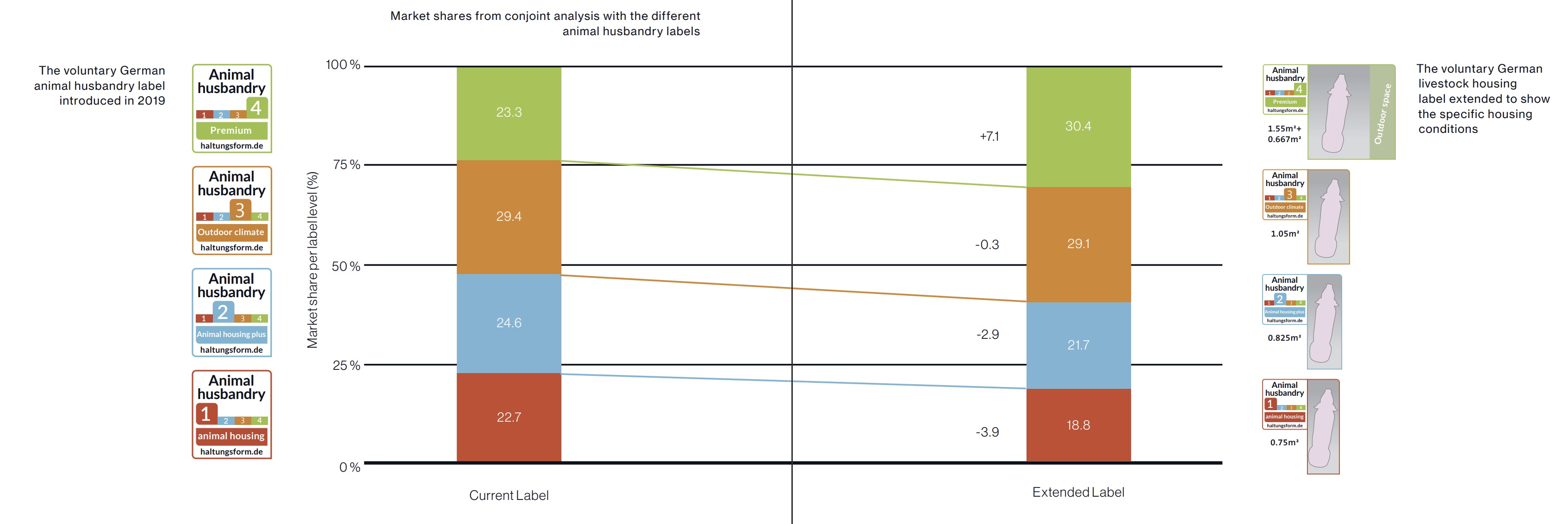 In a large, representative experimental study, we saw whether consumers decided differently when provided with the appropriate information. The results showed that the additional information on the animal husbandry label changed how consumers saw the product and altered their buying behavior. Additional animal husbandry information also significantly lowered the demand for products with less favorable housing conditions and drove demand for products with better housing standards—even among the more price-conscious participants. As a result, market shares significantly shifted toward more animal-friendly products.