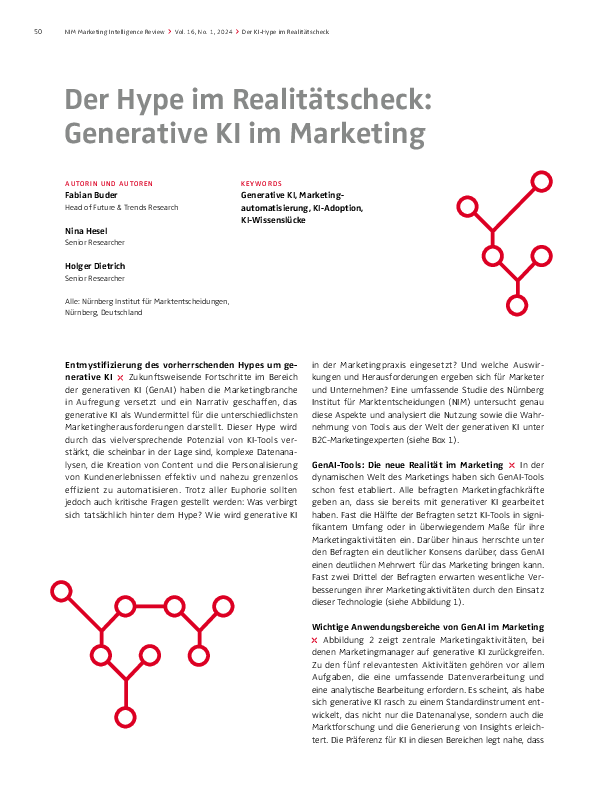 Zukunftsweisende Fortschritte im Bereich der generativen KI (GenAI) haben die Marketingbranche in Aufregung versetzt und ein Narrativ geschaffen, das generative KI als Wundermittel für die unterschiedlichsten Marketingherausforderungen darstellt. Dieser Hype wird durch das vielversprechende Potenzial von KI-Tools verstärkt, die scheinbar in der Lage sind, komplexe Datenanalysen, die Kreation von Content und die Personalisierung von Kundenerlebnissen effektiv und nahezu grenzenlos effizient zu automatisieren. Trotz aller Euphorie sollten jedoch auch kritische Fragen gestellt werden: Was verbirgt sich tatsächlich hinter dem Hype? Wie wird generative KI in der Marketingpraxis eingesetzt? Und welche Auswirkungen und Herausforderungen ergeben sich für Marketer und Unternehmen? Eine umfassende Studie des Nürnberg Institut für Marktentscheidungen (NIM) untersucht genau diese Aspekte und analysiert die Nutzung sowie die Wahrnehmung von Tools aus der Welt der generativen KI unter B2C-Marketingexperten (siehe Box 1).