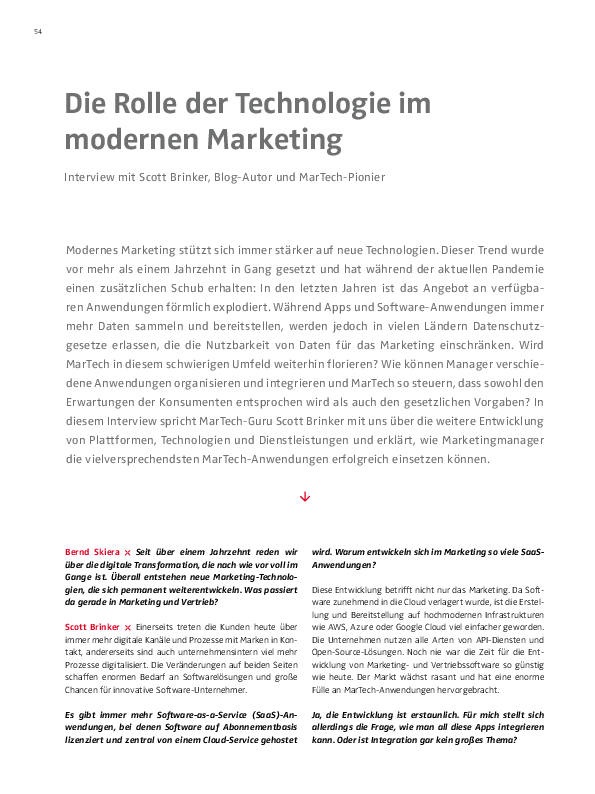 Modernes Marketing stützt sich immer stärker auf neue Technologien. Dieser Trend wurde vor mehr als einem Jahrzehnt in Gang gesetzt und hat während der aktuellen Pandemie einen zusätzlichen Schub erhalten: In den letzten Jahren ist das Angebot an verfügbaren Anwendungen förmlich explodiert. Während Apps und Software immer mehr Daten sammeln und bereitstellen, werden jedoch in vielen Ländern Datenschutzgesetze erlassen, die die Nutzbarkeit von Daten für das Marketing einschränken. Wird MarTech in diesem schwierigen Umfeld weiterhin florieren? Wie können Manager verschiedene Anwendungen organisieren und integrieren und MarTech so steuern, dass sowohl den Erwartungen der Konsumenten entsprochen wird als auch den gesetzlichen Vorgaben? In diesem Interview spricht MarTech-Guru Scott Brinker mit uns über die weitere Entwicklung von Plattformen, Technologien und Dienstleistungen und erklärt, wie Marketingmanager die vielversprechendsten MarTech-Anwendungen erfolgreich einsetzen können.