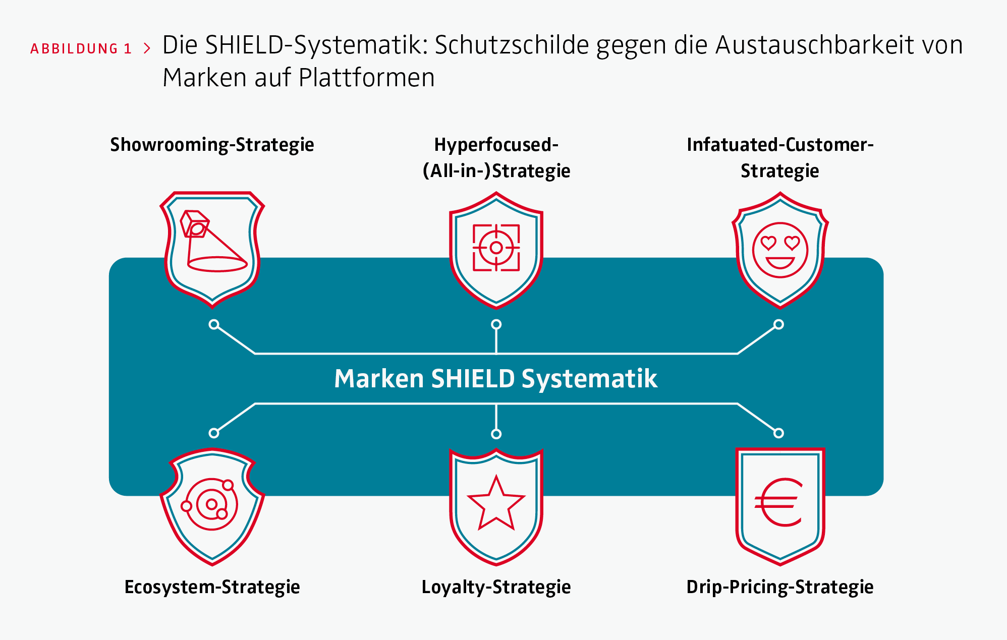 Wir schlagen eine umfassende strategische Systematik vor, die wir SHIELD nennen. Sie stellt ein Schutzschild dar, das Marken im Wettbewerbsumfeld von Plattformen Orientierung gibt und strategische Optionen präsentiert. SHIELD symbolisiert einen robusten Verteidigungsmechanismus, der es Marken ermöglicht, ihre einzigartige Identität zu schützen, direkte Kundenkontakte zu fördern und sich gegen Austauschbarkeit zu wappnen. Abbildung 1 stellt die einzelnen strategischen Komponenten dar, die im Folgenden näher erläutert werden.
