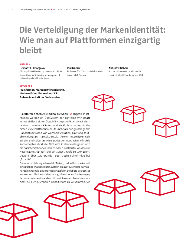 Digitale Plattformen werden im Ökosystem der digitalen Wirtschaft immer einflussreicher. Obwohl ihr ursprünglicher Zweck darin bestand, zwischen Käufern und Verkäufern zu vermitteln, bieten viele Plattformen heute mehr als nur grundlegende Handelsfunktionen wie Warenpräsentation, Kauf und Kaufabwicklung an. Transaktionsplattformen inszenieren sich zunehmend selbst als Mittelpunkt der Interaktion. Für viele Konsumenten rückt die Plattform in den Vordergrund und die dahinterstehenden Marken oder Dienstleister werden zur Nebensache: Man ruft sich ein „Uber“, kauft bei „Amazon“, bestellt über „Lieferando“ oder bucht seinen Flug bei „Expedia“. Diese Verschiebung schwächt Marken, und selbst starke und einzigartige Marken laufen Gefahr, als austauschbare Komponenten innerhalb des enormen Plattformangebots betrachtet zu werden. Marken stehen vor großen Herausforderungen, denn sie müssen ihre Identität und Relevanz bewahren, um nicht zur austauschbaren Einheitsware zu verkommen. Sie müssen sich in einer Marktdynamik zurechtfinden, in der Plattformen wichtige Aspekte des Kundenerlebnisses und der Interaktion mit der Marke kontrollieren und in die direkte Beziehung zwischen einer Marke und ihren Kunden eingreifen. Im Umfeld immer dominanter werdender Plattformen sind innovative Strategien gefragt, die die Markenidentität stärken und den Aufbau loyaler Beziehungen ermöglichen, um wettbewerbsfähig und einzigartig zu bleiben.
