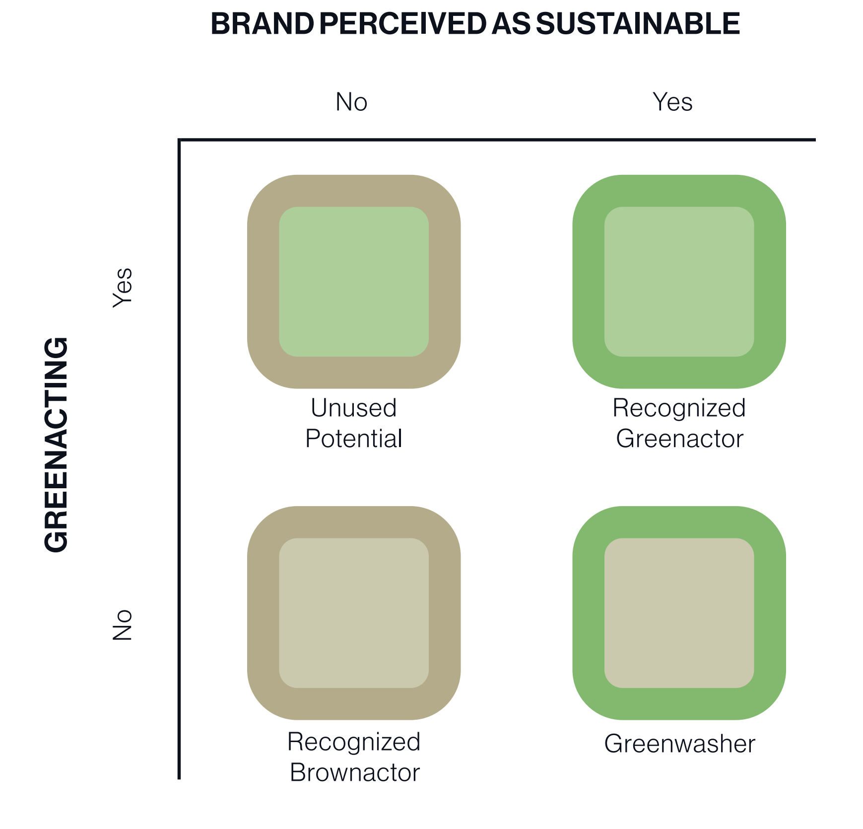 However, even a truly “green” brand purpose can only be translated into a competitive advantage if it reaches consumers and resonates with their values and attitudes. If it does not, managers may even be tempted to consider abandoning costly sustainability initiatives if their good deeds go unnoticed—and unpaid for—by customers. The interplay between a brand’s initiatives and consumers’ perceptions of the brand is illustrated in the matrix on the next page. Recognized green actors walk a fine line between wasting their hidden potential and greenwashing. This balancing act requires scrutiny and management of the perceived brand purpose. Yet, it’s challenging to manage what cannot be measured.