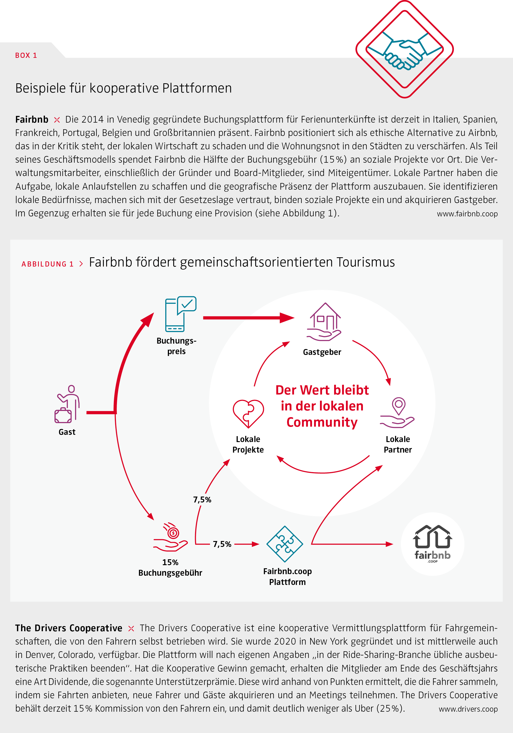 Dieses alternative Geschäftsmodell bedient sich derselben Technologien wie die Mainstream-Plattformen, hat aber andere Eigentümerstrukturen, die Mitarbeiter, Kunden und weitere Stakeholder einbeziehen. Im Zentrum der Plattformkooperativen steht die Solidarität zwischen Nutzern und Eigentümern. Alle Interessengruppen sollen von der Innovation und Effizienz der Plattform profitieren. Kooperative Plattformen gelten als Gleichberechtigung und Gemeinschaft fördernde, nachhaltige Alternative zu den etablierten Playern und zeigen, wie eine gerechtere Zukunft der Platform Economy aussehen könnte. Da sie aufgrund ihres Gewinnbeteiligungsmodells eine geringere Rendite versprechen, sind sie für traditionelle Investoren jedoch weniger interessant, was ihre Finanzierung schwierig macht. Zudem kann die Heterogenität der Stakeholder das Plattformmanagement erschweren und Entscheidungsprozesse verlangsamen. Sich gegen die etablierten Player zu behaupten, ist deshalb nicht einfach. Box 1 stellt zwei Beispiele kooperativer Plattformen vor.