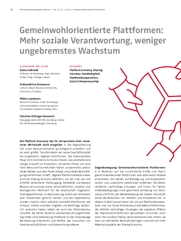 Die Digitalisierung hat unser Konsumverhalten grundlegend verändert und als wohl größte Transformation ein neues Geschäftsmodell hervorgebracht: digitale Plattformen. Der bedeutendste Player im E-Commerce ist heute Amazon, das einerseits eine riesige Auswahl an Produkten, attraktive Preise und eine hohe Benutzerfreundlichkeit bietet, andererseits jedoch lokale Händler aus dem Markt drängt und prekäre Beschäftigungsverhältnisse schafft. Digitale Plattformmodelle haben auch die Sharing Economy befördert, von der man sich viel erhoffte: einfacheren Marktzugang, Flexibilität und bessere Ressourcennutzung sowie wirtschaftlichen, sozialen und ökologischen Mehrwert für die Gesellschaft insgesamt. Sharingplattformen, so die Erwartung, sollten den Interessen aller Stakeholder gerecht werden und den Kapitalismus sozialer machen. Doch während namhafte Plattformen wie Amazon, Airbnb und Uber Angebot und Nachfrage tatsächlich verändert haben, haben sie auch den Materialismus verstärkt. Sie stehen heute für wachsende Lohnungleichheit, Gig Arbeit ohne Absicherung, Probleme für die ortsansässige Bevölkerung, Emissionen und Abfälle, das Ausnutzen von Gesetzesschlupflöchern und Datenschutzprobleme.