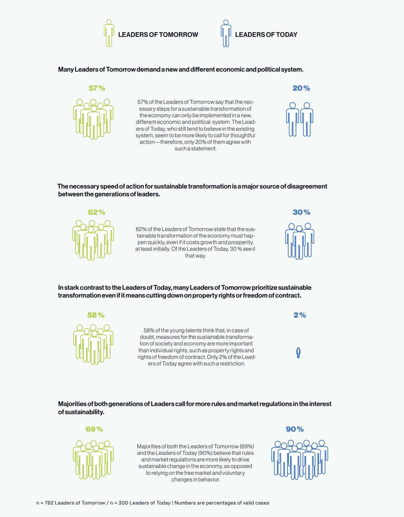 Interestingly, 62% percent of young leaders prioritize a better climate over growth and prosperity, and almost half of them find that breaking rules or laws is acceptable if it helps the environment. 57% believe that climate protection is only achievable through radical changes—creating a new, different economic and political system.