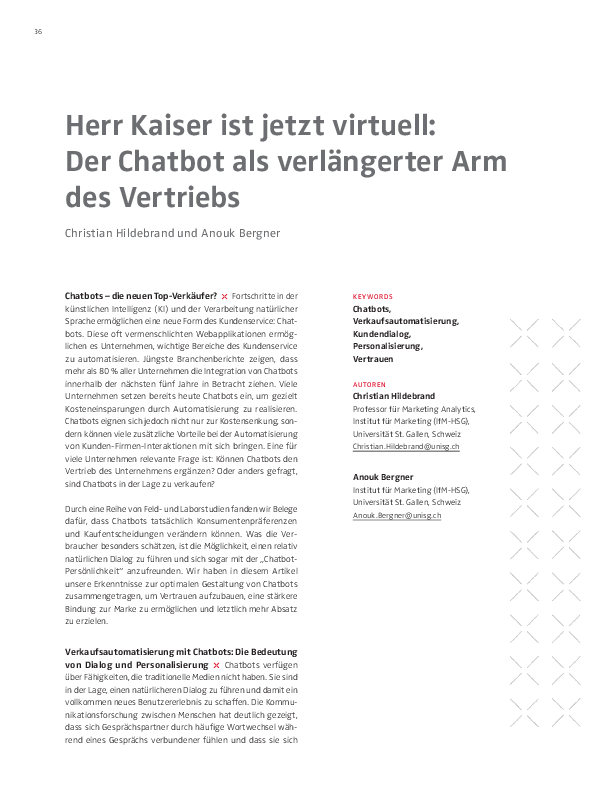 Die in der Unternehmenspraxis implementierten Chatbot-Varianten sind breit gefächert. Sie reichen von menschenähnlichen Bots bis hin zur bloßen Präsentation eines Markenlogos oder eines einfachen, digitalen Avatars. Einige Anwendungen bieten ein Maximum an Information mit einem sehr reduzierten Dialog zwischen Benutzer und Benutzeroberfläche, andere arbeiten mit einer höheren Interaktionsfrequenz. Anstatt die Standardvarianten von Anbietern direkt zu übernehmen, sollten Unternehmen sehr sorgfältig prüfen, wie sich die unterschiedlichen Ausgestaltungen der Chatbots auf die Benutzerfreundlichkeit und unternehmensrelevante Zielgrößen auswirken. Einfache Gestaltungsmöglichkeiten, wie häufigere, dafür aber kürzere Wortwechsel, führen zu mehr Vertrauen und einem angenehmeren Kundenerlebnis. Auch die Anpassung von Chatbots an grundlegende Eigenschaften der Konsumenten wirkt vertrauensbildend und stärkt die Bindung zwischen Kunden, Chatbot und letztendlich der Marke. Führungskräfte sollten Chatbots daher nicht nur als digitales Tool zur Kostenreduktion durch Service-Automatisierung sehen. Umsichtig implementierte Chatbots sind in der Lage, den Vertrieb zu verstärken und Zusatzverkäufe zu erzielen.