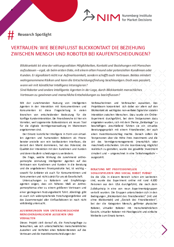 Dieses Projekt zielt darauf ab, die Forschungsfrage zu beleuchten, wie sich unterschiedliches menschenähnliches Aussehen und Verhalten eines Roboter-Beraters auf das Vertrauen und die Investitionsentscheidungen der Verbraucherinnen und Verbraucher auswirken. Das Projektteam konzentriert sich dabei vor allem auf den Blickkontakt als wichtigstes nonverbales Signal der sozialen Interaktion zwischen Menschen. Dazu wurde ein Online-Experiment durchgeführt, bei dem Testpersonen dazu eingeladen wurden, sich mit dem Thema „Geldanlage“ zu beschäftigen. Anschließend führten sie ein virtuelles Beratungsgespräch mit einem Finanzberater, der auch einen Investitionsvorschlag machte. Danach sollten die Testpersonen über die Höhe ihres Investments und die Art des Vermögensmanagements (menschlich oder maschinell) entscheiden. Um die Incentivierung möglichst realistisch zu gestalten, wurde das gewählte Investment simuliert und – umgerechnet in eine Teilnahmegebühr – ausgezahlt.