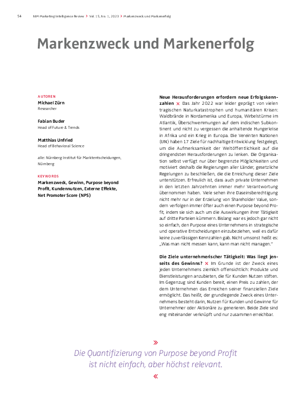 Zürn, M., Buder, F., & Unfried, M. (2023). Brand Purpose and Brand Success. NIM Marketing Intelligence Review, 15(1), 54-59. https://doi.org/10.2478/nimmir-2023-0008