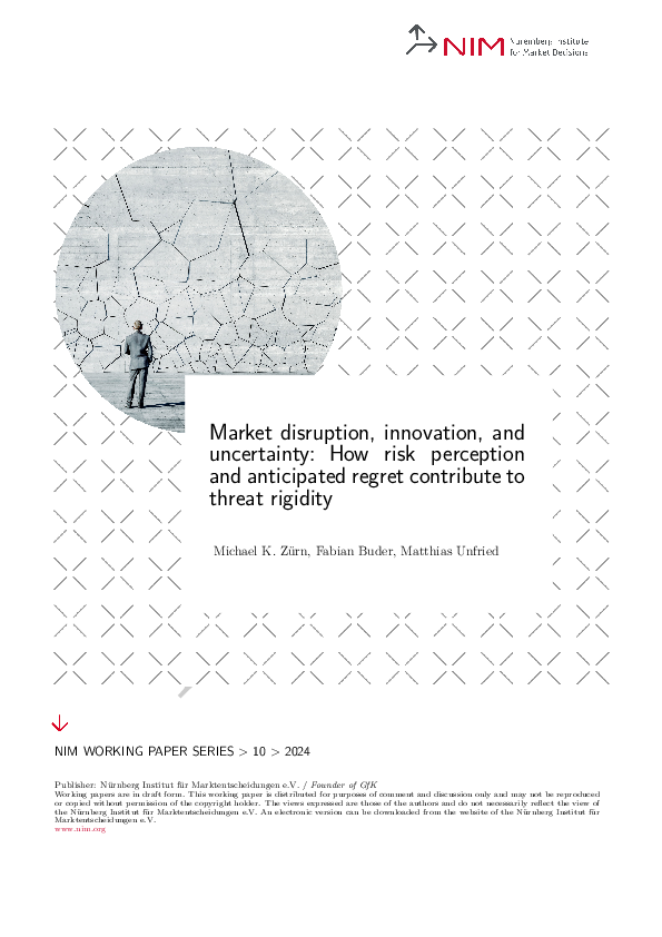In the face of market disruptions, decision makers often need to innovate their products or even their entire business model to remain competitive. However, decision makers are too often unwilling to take the risk of innovation when facing a threat to their businesses. While the necessity to innovate must always be evaluated individually, systematic biases such as threat rigidity inevitably prevent some vital innovations from being implemented. We take a psychological perspective on threat rigidity and test how market disruptions affect decision makers’ risk perception and anticipated regret in innovation decisions. Behavioral decision theories suggest that decision makers seek risk under threat which initially contradicts the observation of threat rigidity. Our results indicate that biased risk perception contributes to threat rigidity because under threat, innovation appears relatively less risky. Crucially, this shift in risk perception interferes with the risk-seeking that is commonly observed for expected losses. Furthermore, threats amplify the anticipated regret associated with innovation, which contributes to threat rigidity because regret avoidance prevents decision makers from actively deviating from the status quo. We discuss the managerial implications of our findings and outline avenues for future research.