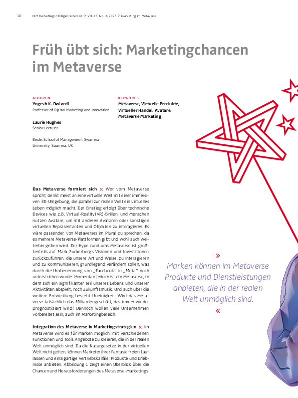 Man geht davon aus, dass sich Metaverse-basierte Einkaufsmöglichkeiten zunächst neben üblichen Onlineshops und Offlinekanälen wie z. B. stationären Läden bilden und quasi ein dritter Raum entstehen wird. Das Metaverse wird dort neue Chancen bieten, bestehende und potenzielle Kunden mit immersiven Erlebnissen zu erreichen. Daher sollten Marketingmanager eine umfassende und Channel-übergreifende Strategie für die drei Bereiche entwickeln. Die virtuelle Welt ermöglicht neue sinnvolle und umfassende Interaktionen und Markenerlebnisse, die über das physische Einkaufen hinausgehen. Der hohe Grad an Immersion und Interaktivität kann auch für physische Läden von Vorteil sein. So können beispielsweise kleine Händler ihren begrenzten Raum durch zusätzliche digitale Ladenflächen im Metaverse erweitern, um ihr gesamtes Produktsortiment wirkungsvoll zu präsentieren. Kunden können in solchen Läden hochpersonalisierte Angebote erleben oder Produkte direkt zu Hause ausprobieren. IKEA hat z. B. Augmented-Reality(AR)-Anwendungen eingeführt, mit denen Kunden ausprobieren können, wie eine Lampe im eigenen Zimmer aussieht. Auch Dyson ist bereits mit einer eigenen Virtual-Reality-App am Start, die Kunden ermöglicht, Produkte in einer immersiven Onlineumgebung zu testen.
