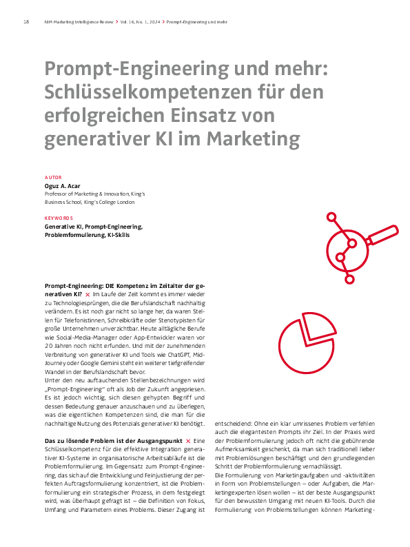 Um die zunehmenden Möglichkeiten generativer KI wirklich nutzen zu können, müssen Manager über Prompt-Engineering hinausdenken. KI-Systeme sind heute schon sehr gut in der Lage, die Intentionen ihrer Nutzer zu verstehen und sogar selbst Prompts zu generieren. ChatGPT-4 kann beispielsweise selbständig aus einfachen Vorgaben komplexe Prompts für die Erstellung von Bildern in DALL-E erzeugen. In einer kürzlich durchgeführten Studie wurde ein neues Ablaufschema namens GATE (Generative Active Task Elicitation) vorgestellt, das mit KI-generierten Prompts nicht nur bessere Ergebnisse erzielte als menschliche Eingaben, sondern auch neuartigere und weiterreichende Vorschläge erzeugte, als von den Nutzern ursprünglich erwartet. Um bei dieser neue Transformationswelle vorne mit dabei zu sein, müssen Marketingexperten konsequent und kontinuierlich experimentieren, lernen und sich weiterentwickeln. Es geht nicht nur um die gründliche und proaktive Erforschung neuer KI-Tools und von deren Grenzen, sondern auch um die Weiterentwicklung der Fähigkeit, komplexe Probleme klar zu formulieren und KI-produzierte Ergebnisse kritisch zu bewerten. Während sich das Angebot an generativer KI permanent weiterentwickelt, sind es diese Fähigkeiten – komplexe Probleme zu erkennen und zu formulieren, KI-generierte Lösungen zu analysieren und beim Lernen agil zu bleiben –, die konstant bleiben und den Unterschied zwischen KI-Leadern und Mitläufern ausmachen werden.