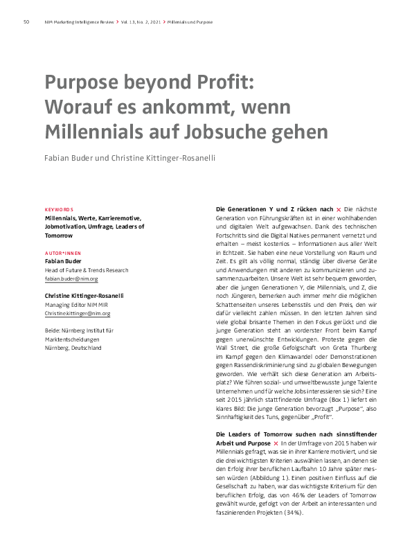 Keywords: Millennials, Werte, Karrieremotive, Jobmotivation, Umfrage, Leaders of Tomorrow