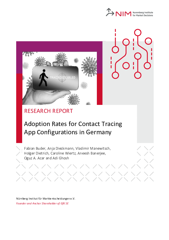 Buder, F., Dieckmann, A., Manewitsch, V., Dietrich, H., Wiertz, C., Banerjee, A., Acar, O. A., & Ghosh, A. (2020). Adoption Rates for Contact Tracing App Configurations in Germany. NIM Research Report.