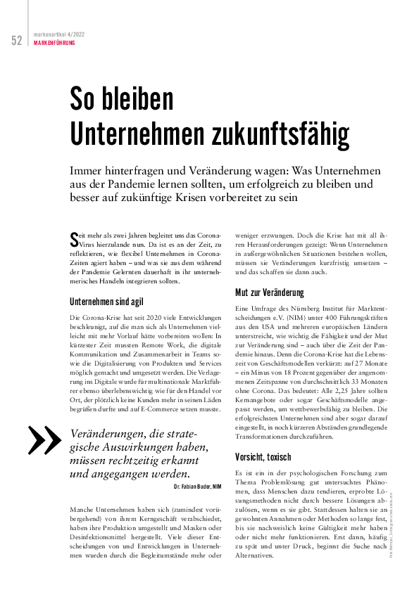 Buder, F., & Hesel, N. (2022). So bleiben Unternehmen zukunftsfähig. Markenartikel 4/2022.