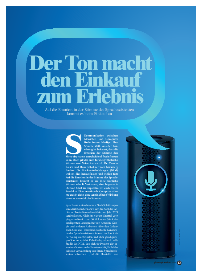 Kommunikation zwischen Menschen und Computern findet immer häufiger über Stimme statt. Aus der Forschung ist bekannt, dass die Emotion der Stimme den Verkaufsprozess entscheidend beeinflussen kann. Doch gilt das auch für die synthetische Stimme von Voice Assistants? Dr. Carolin Kaiser und René Schallner vom Nürnberg Institut für Marktentscheidungen (NIM) wollten dies herausfinden und stellen fest: Auf die Emotion in der Stimme des Sprachassistenten kommt es an.
