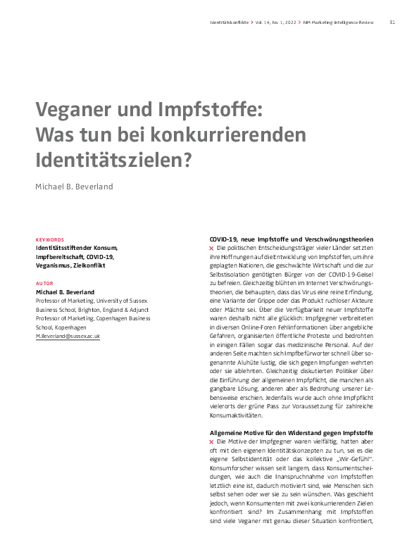 Keywords: Identitätsstiftender Konsum, Impfbereitschaft, COVID-19, Veganismus, Zielkonflikt