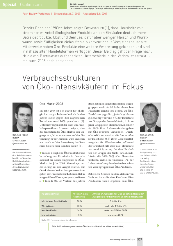 Buder, F., & Hamm, U. (2009). Verbrauchsstrukturen von Öko-Intensivkäufern im Fokus. Ernährungs Umschau 2009(09), 527–533.