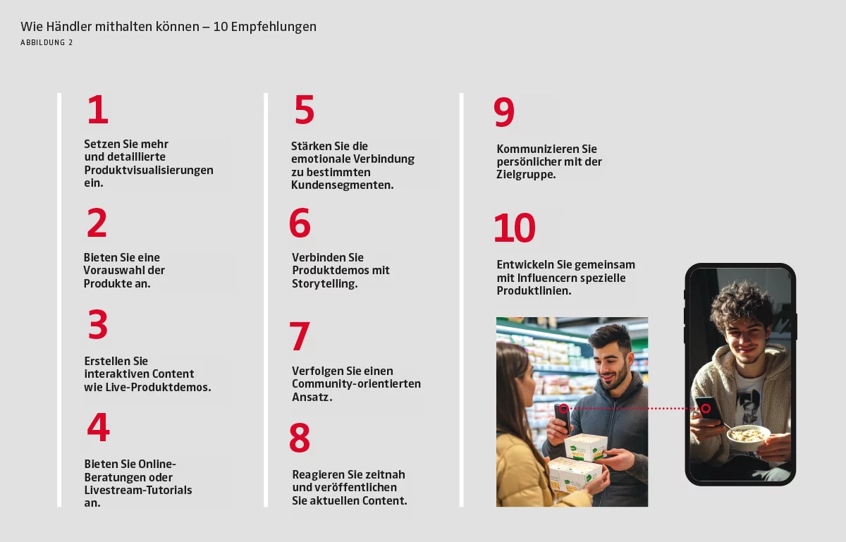 Der Handel muss auf diese Entwicklungen reagieren und kann sich von Influencern einiges abschauen. Durch stärker personalisierte und interaktive Ansätze und die Vorauswahl der präsentierten Produkte können auch Händler ihren Kundinnen und Kunden mehr Orientierung und Sicherheit geben. Auch in Sachen Flexibilität machen es ihnen die Online-Trendsetter vor: Influencer sind Meister darin, schnell relevanten Content zu erstellen, der in Echtzeit auf die Wünsche und Bedürfnisse der Zielgruppe eingeht. Sie reagieren zügig auf Trends und ihr Content wirkt stets frisch und aktuell. Um eine ähnliche Unmittelbarkeit zu erreichen, könnten Einzelhändler typische Influencer-Content-Formate übernehmen, etwa Frage-und-Antwort-Sessions, Blicke hinter die Kulissen oder von ihren Mitarbeitern erstellte Inhalte. Abbildung 2 zeigt Influencer-Strategien auf, die Einzelhändler in einer immer stärker von Influencern geprägten Handelslandschaft in Betracht ziehen sollten.