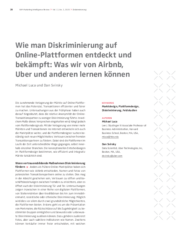Untersuchungen zeigen auch auf Online-Marktplätzen, von Stellenmärkten über die Kreditvergabe bis hin zum Immobilienmarkt, rassistische oder ethnische Diskriminierung. Plattformen sollten deshalb untersuchen, wie Plattform-Designentscheidungen und Algorithmen das Ausmaß der Diskriminierung auf einem Marktplatz beeinflussen können. Mit einem besseren Bewusstsein für diese Problematik können Manager das Problem proaktiv angehen. Eine einfache, aber wirksame Maßnahme besteht in vielen Fällen darin, dass Plattformen potenziell sensible Nutzerdaten wie Hautfarbe oder Geschlecht bis nach dem Abschluss einer Transaktion zurückhalten. Plattformen können auch auf die Bequemlichkeit der Nutzer setzen, um Diskriminierung vorzubeugen. Man kann die Standardeinstellungen einer Plattform so wählen, dass sie Diskriminierung unterbinden, wie zum Beispiel das „Instant Booking“-Feature bei Airbnb. Die meisten Nutzer werden bei diesen Einstellungen bleiben. So haben zum Beispiel Untersuchungen in den unterschiedlichsten Kontexten gezeigt, dass Menschen dazu neigen, sich für die Alternative zu entscheiden, die als Standard festgelegt ist. Wichtig ist, dass Diskriminierung und mögliche Lösungen zu deren Vermeidung transparent diskutiert werden.
