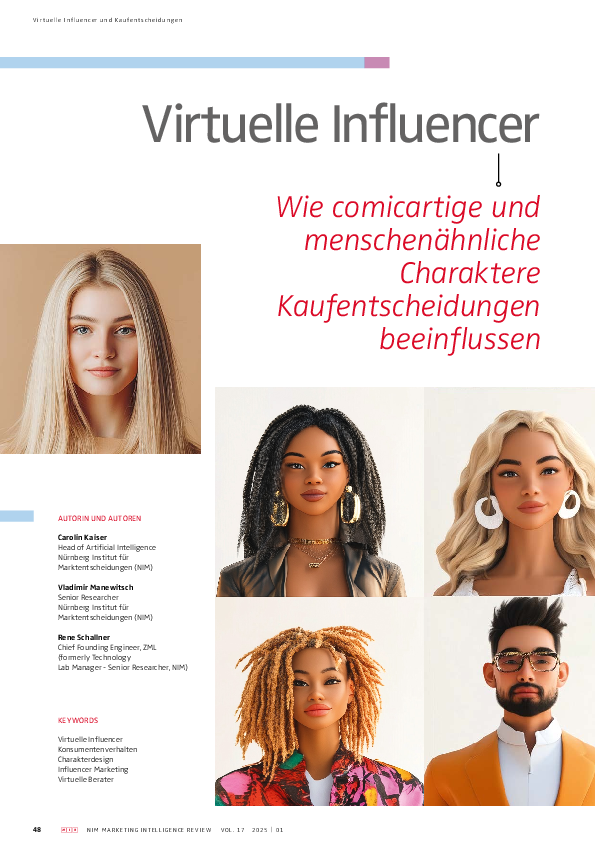 Kaiser, C., Manewitsch, V., & Schallner, R. (2024). The human factor in virtual influence: Decoding the role of human-like traits in digital characters on shaping consumer choices and brand engagement. NIM Insights 2024/2.