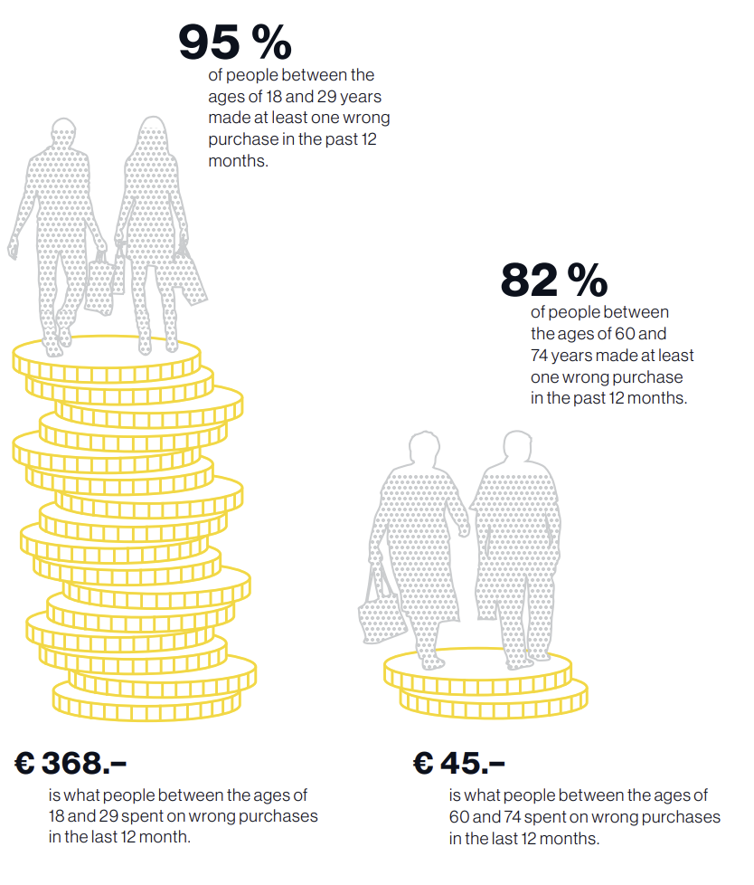 Fortunately, wrong purchases go down the older one becomes. While 95% of adults between the ages of 18 and 29 years say they have made at least one wrong purchase in the past 12 months, the percentage drops to 82% for people between the ages of 60 and 74 years. Even more telling is the decline in spending levels. Best agers, for example, say they have spent €45 on wrong purchases in the past 12 months. According to their figures, 18- to 29-year-olds spent €368 in the same period, around eight times as much on items they subsequently rated as wrong purchases.
